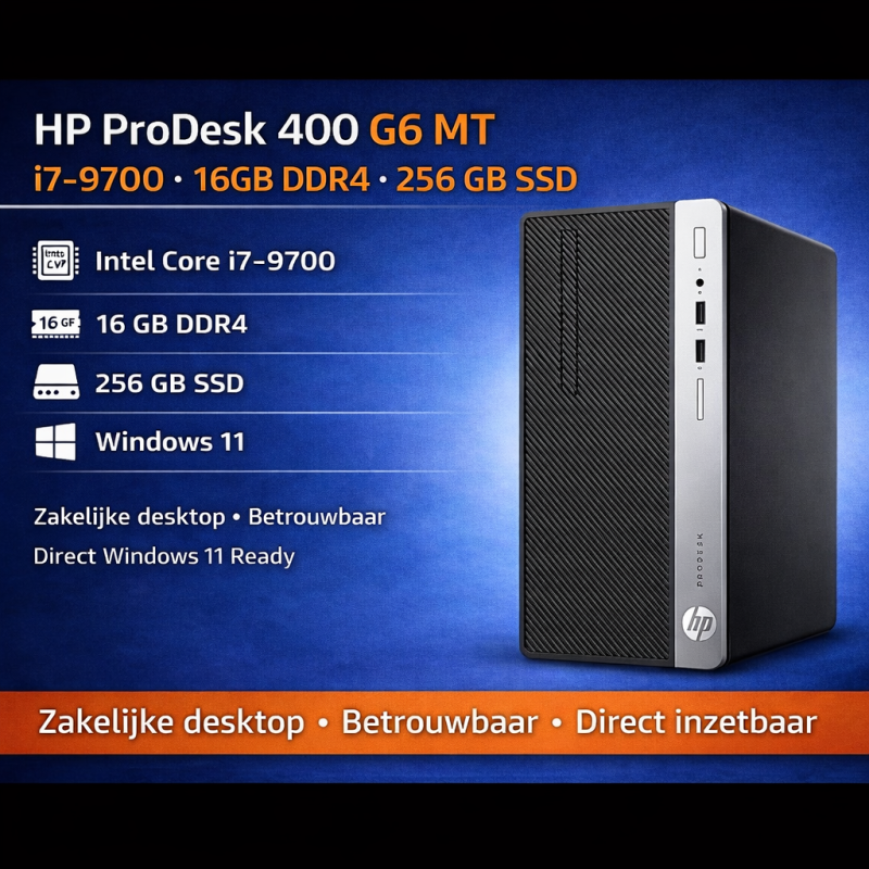 HP Prodesk 400 G5 SFF Intel Core | i7-8700 ( 4.6 GHz) 16GB DDR4 SDRAM werkgeheugen 256GB SSD NVMe PCI-e opslagcapaciteit Windows 11 64bits 4x USB-3.2, 4x USB-2.0, 1x DP, 1x VGA 1x audio uit, 1x LAN poort Gewicht: 5.5 KG Refurbisched (A grade)