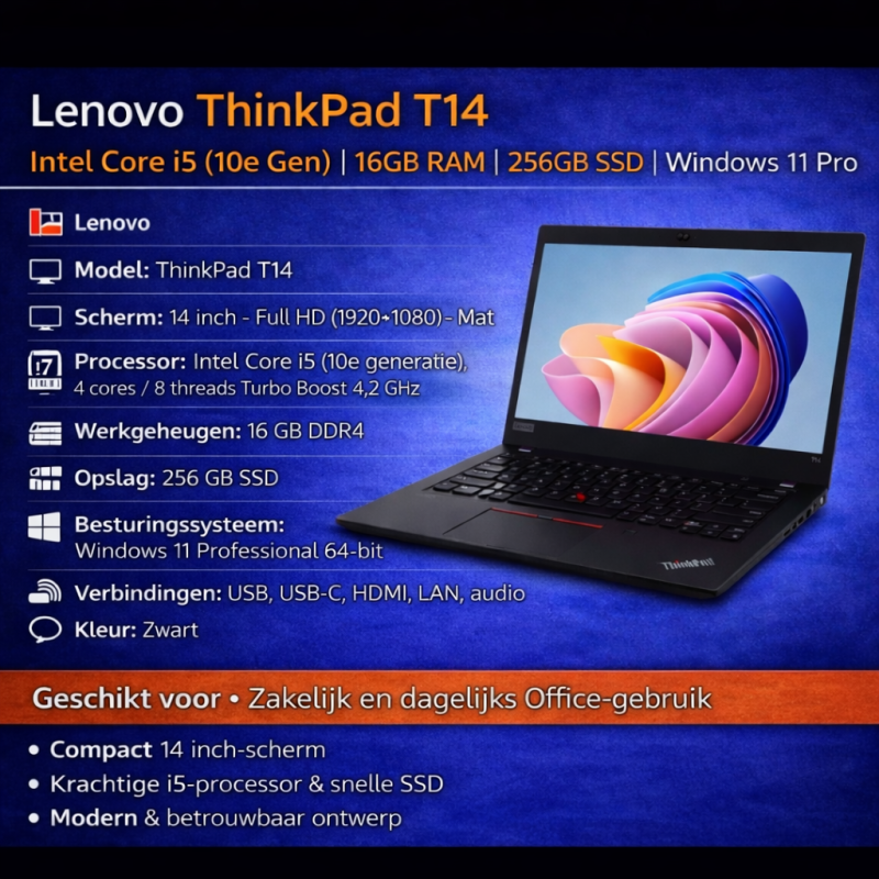 Lenovo ThinkPad T14 Gen 1 – Core i5-10210U | 8GB RAM | 256GB SSD | Windows 11 Pro De Lenovo ThinkPad T14 Gen 1 is een betrouwbare zakelijke laptop, gebouwd voor dagelijks intensief gebruik. Dankzij de Intel Core i5-processor, snelle SSD en de bekende ThinkPad-bouwkwaliteit is dit model ideaal voor kantoor, thuiswerken en studie. Specificaties Merk:...